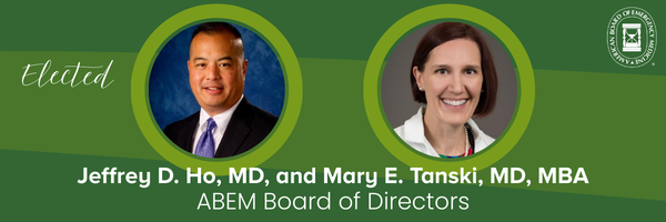 “We are pleased to introduce Jeffrey D. Ho, MD, and Mary E. Tanski, MD, MBA, as our newly elected Directors. Dr. Ho and Dr. Tanski are ABEM-certified physicians who have served as dedicated leaders and valued volunteers in ABEM activities, ” stated James D. Thomas, MD, ABEM President. “Their expertise and insights will significantly contribute to ABEM’s mission and advance our activities in support of ABEM-certified physicians.”