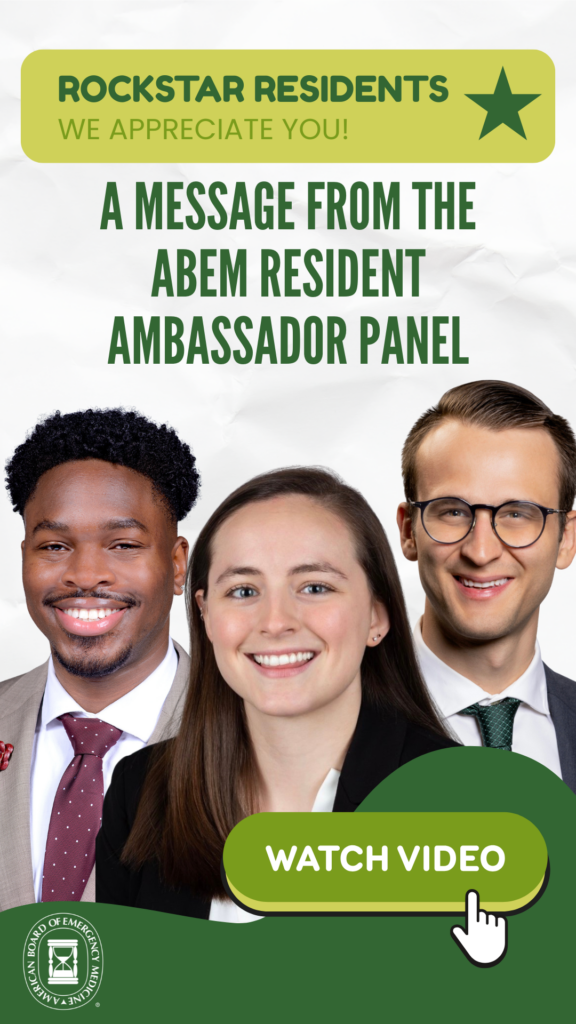 Follow ABEM on social media as we highlight EM residents from around the country and watch the latest video from our Resident Ambassador Panel here.